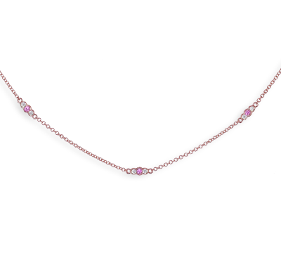 0.60ct fine quality pink sapphires & 0.40ct round diamonds (G/SI1 quality). Necklace has total of 9 diamond links set equally apart around a 16″ chain.